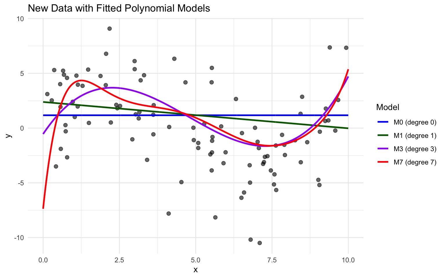 Notice that while there were some high y-values on around x=1 in the training data, which pulled model 7 upward in that region, these values are not present in the new data. Model M7 appears to overpredict most of the y-values in this region. It appears that the behavior in the training data close to \(x=1\) was due more to noise than signal, and the more flexible model suffers because it responds too aggressively to the noise.